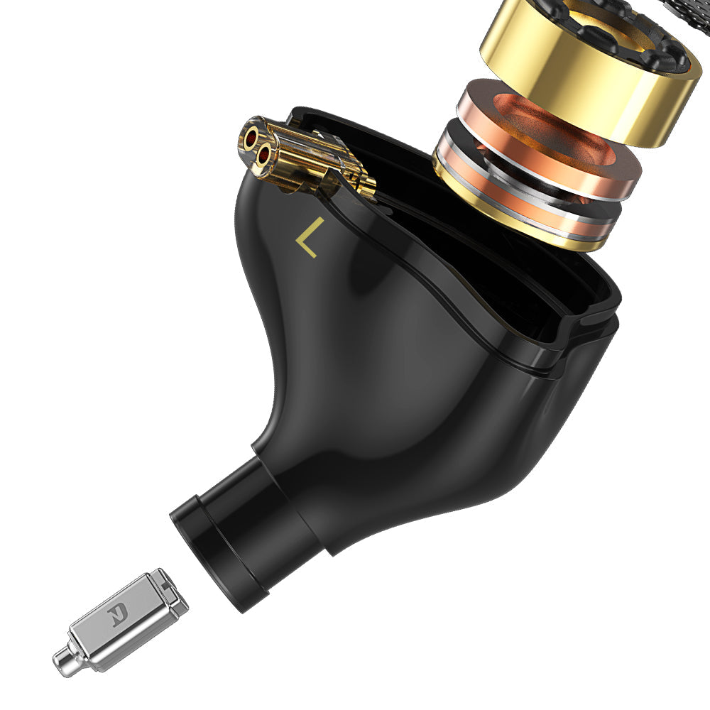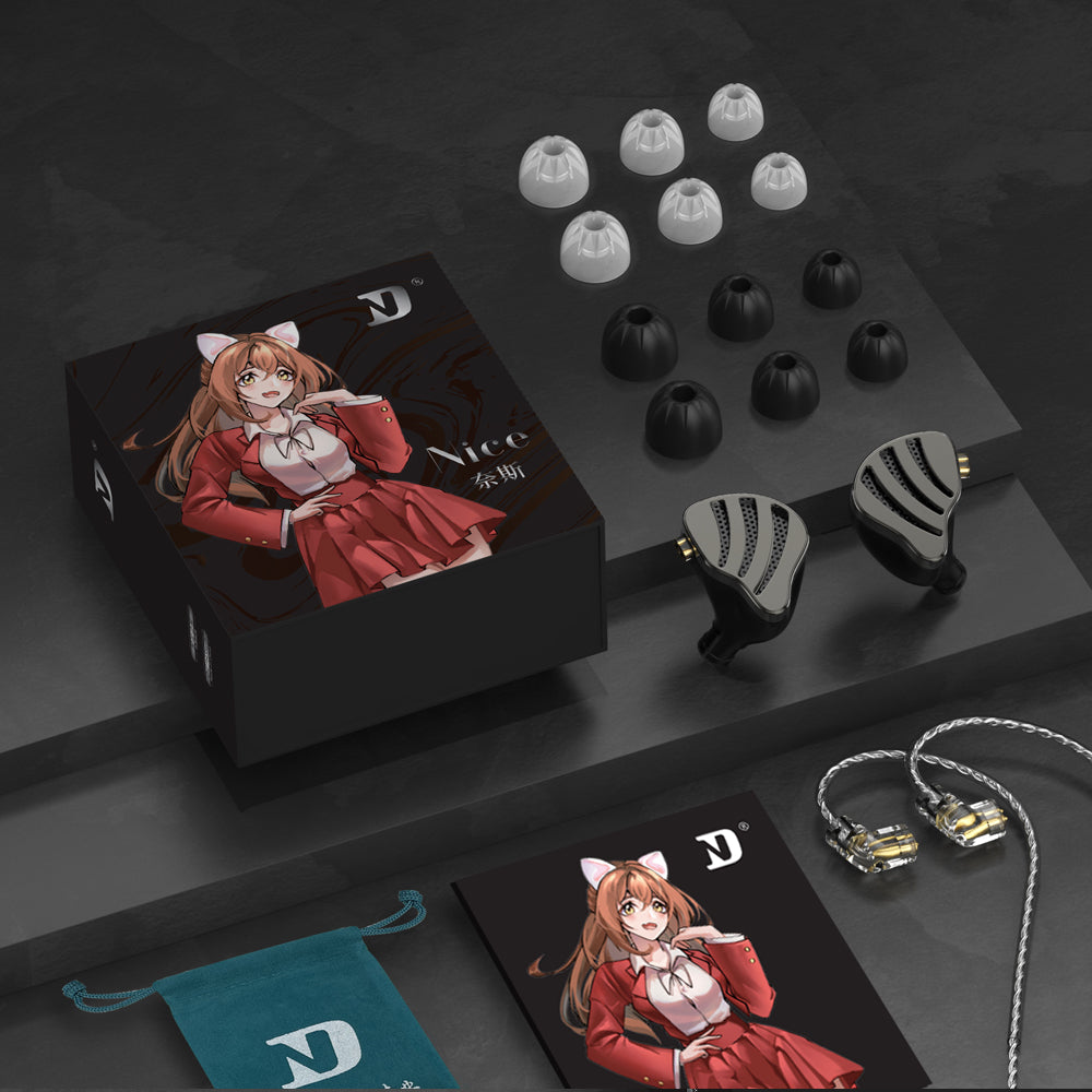 The dynamic driver unit of NICE utilizes a new generation of large-sized PET dome diaphragm, dual magnets, and ultra-fine CCAW metal voice coil. This surpasses regular single-magnet dynamic drivers, providing excellent performance across the full frequency range with dynamic acoustic expression. The balanced armature driver is equipped with a composite diaphragm made of high-hardness metal, offering powerful high-resolution capability and smooth mid-high frequencies.